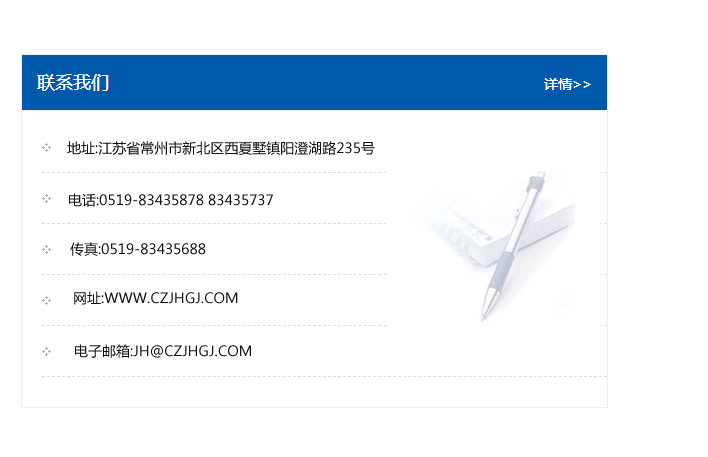 地址:常州市新北區友邦商務大廈1幢16、17層  電話:0519-85101652  傳真:0519-85112595  郵編:213022  網址:www_cz-jiayue_cn.dghefa168.com  郵箱:xiajifengaa@163.com